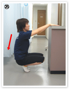 (腕は伸ばしたまま膝をゆっくり曲げていき、腰を下ろす) |